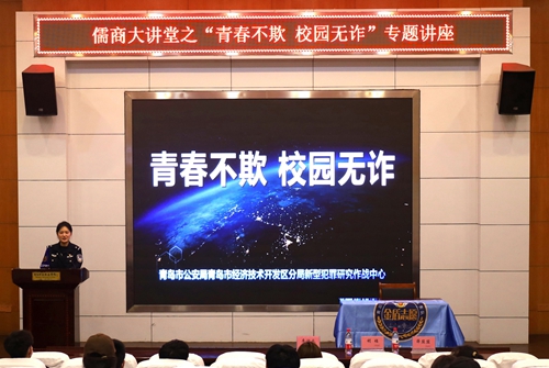 为增强新型网络诈骗防范意识,11月25日,商学院特邀请青岛市公安局开发区分局警官胡铭在学校报告厅举办“青春不欺,校园无诈”主题讲座。商学院大一新生1000余人通过线上线下方式聆听了讲座。