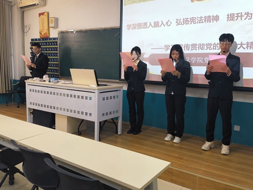 信息学院学生宪法卫士普法团队成员在宣讲宪法