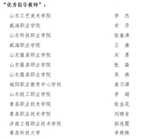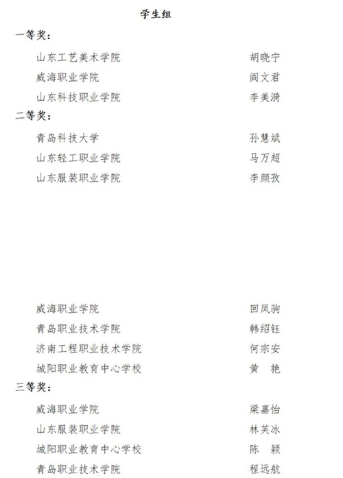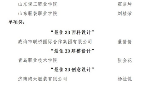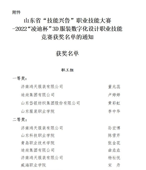 12月16日,山东省“技能兴鲁”职业技能大赛—2022“凌迪杯”3D服装数字化设计职业技能竞赛公布大赛成绩,维多利亚vic003艺术学院服装与服饰设计专业教师张金花荣获职工组二等奖,获得“最佳3D建模设计”奖,学生韩绍钰荣获学生组二等奖,程远航荣获学生组三等奖,张金花、刘晓音获“优秀指导教师”称号。