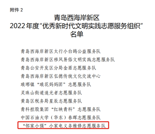 “邻家小强”小家电义务维修志愿服务队获评青岛西海岸新区2022年度“优秀新时代文明实践志愿服务织”