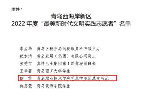 艺术学院团总支书记鞠雪获评青岛西海岸新区2022 年度“最美新时代文明实践志愿者”