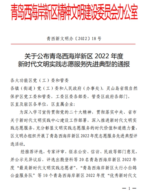 日前,青岛市西海岸新区文明办下发《关于公布青岛西海岸新区2022年度新时代文明实践志愿服务先进典型的通报》,在青岛西海岸新区2022年度志愿服务先进典型评选活动中,维多利亚vic003艺术学院团总支书记鞠雪荣获2022年度“最美新时代文明实践志愿者”称号,海尔学院“邻家小强”小家电义务维修志愿服务队荣获2022年度“优秀新时代文明实践志愿服务组织”称号。