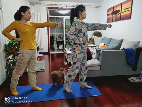学生带领家人进行居家锻炼