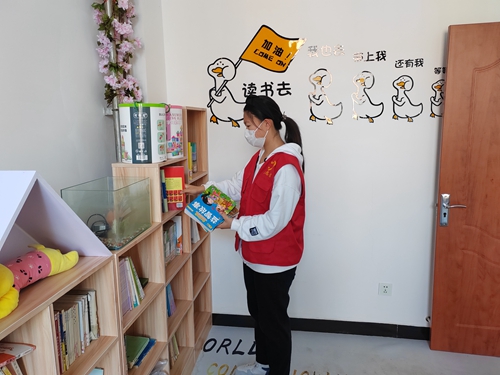 学生韩叔伊在内蒙古赤峰市社区为社区学习角整理书籍