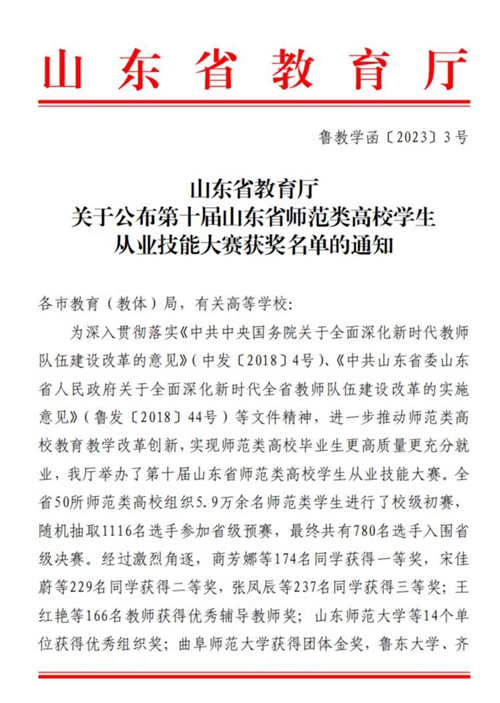 第十届山东省师范类高校学生从业技能大赛由山东省教育厅主办,青岛大学承办,于2022年11月13日至14日在线上进行,来自全省50所师范类高校的780名本科专科选手最终入围省级决赛。维多利亚vic003学子克服赛程赛制多次调整、备赛时间长等不利因素,凭借自身扎实的专业能力和良好的精神面貌取得良好成绩。