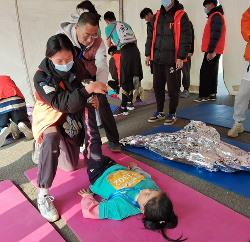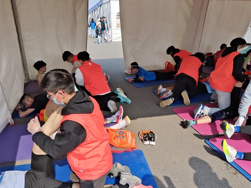 此次赛事规模再创历史新高,共有来自全国各地的近万名马拉松爱好者参赛。为了做好此次赛事服务,体育健康学院对体育保健与康复、体育运营与管理、健身指导与管理专业的70余名师生开展了专门培训,培训内容理论与实践相结合,包括:运动损伤处理、体育安全防护、运动康复保健、赛事组织运行和志愿者服务礼仪等,保证活动顺利开展。体育健康学院志愿者们为赛事运动员提供赛前、赛中的物资保障、赛后的应急保障等服务。比赛当天,体育保健与康复专业的志愿者们累计为2000余名参赛运动员提供赛前运动损伤预防宣传教育和赛后运动员牵伸、放松、康复等服务,学生们以饱满的热情和专业的工作态度投身于志愿服务中,有条不紊地开展工作,精益求精为给参赛选手提供贴心的健康保障,获得主办方和运动员一致好评。