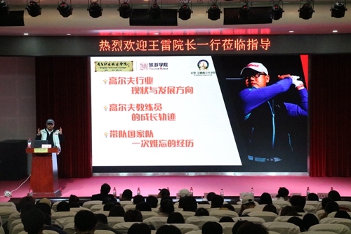 王雷为休闲服务与管理专业师生开展了专题讲座。王雷从高尔夫行业现状与发展方向、高尔夫教练员的成长轨迹、难忘的经历(带队国家队)三部分内容展开讲述。王雷精准把脉高尔夫行业发展趋势,用精湛的教练技术,凝练出高尔夫教练员所具备的十个基本素质,并阐述了如何专注以及如何快速走出负面情绪。王雷在讲座中融合高尔夫人的品质精神,结合为他人着想、尊重他人、身负使命感等内容,为学生同时开展了一节生动的思政课。