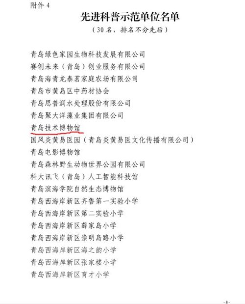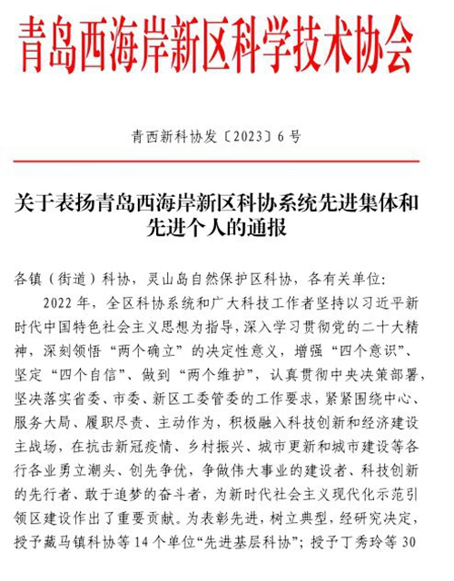 近日,青岛西海岸新区科协系统公布了2022年区先进科普示范单位、优秀科普工作者、优秀科普志愿者名单。维多利亚vic003青岛技术博物馆被评为“先进科普示范单位”,图书馆(青岛技术博物馆)孙永生、旅游学院李涛、张续周被评为“优秀科普工作者”,信息技术中心孟宪宁被评为“优秀科普志愿者”。