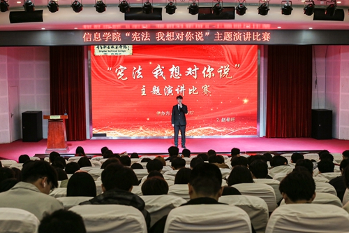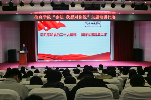比赛中,参赛选手们紧紧围绕“宪法,我想对你说”这一主题,用精心组织的语言表达内心对宪法的崇敬和理解,从大学生的视角,诠释了“学法、守法、用法、护法”的重要性。比赛现场,选手们以饱满的激情、昂扬的姿态、真挚的情感讲诉自己与宪法的故事,信息学院2022级软件技术专业学生赵希旺以极具感染力的演讲方式,带动全场氛围,获得了比赛第一名。活动最后,李明杰围绕“学习贯彻党的二十大精神,做好宪法普法工作”主题作总结讲话。她强调了普及宪法工作的重要意义,分享了相关案例,希望学生们强化自身法律意识,加强法律知识学习,鼓励学生们积极弘扬法治精神,努力成为一名知法、懂法、守法的社会主义建设者和接班人。