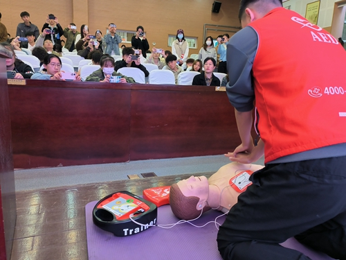 4月14日上午,后勤管理处在学校报告厅组织开展了心肺复苏与自动体外除颤器技能培训。学校医务人员、2022级新生辅导员、班长及学生代表等100余人参加了培训。培训以理论讲解、现场教学、模拟演练的形式开展,由青岛悟空智联医疗科技有限公司培训总监刘元杰主讲,后勤管理处副处长丁洪霞主持。