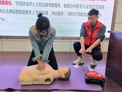 培训中,刘元杰强调了急救的重要性,通过PPT讲解和现场实操相结合的方式,深刻讲解了心肺复苏与自动体外除颤器的适用范围、操作步骤、操作要点和注意事项,同时还向师生演示了海姆立克急救法的具体操作。参加培训的师生代表现场进行了模拟演练,刘元杰进行了详细现场指导。