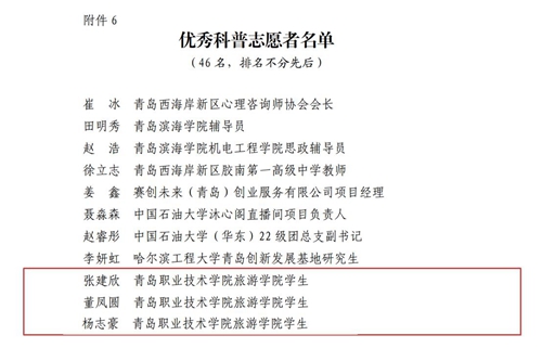 近日,青岛西海岸新区科学技术协会发布《关于表扬青岛西海岸新区科协系统先进集体和先进个人的通报》。旅游学院师生多人获评“优秀科普工作者”与“优秀科普志愿者”,其中,国家级职业教育教师教学创新团队成员李涛、张续周获评“优秀科普工作者”,旅游管理专业学生杨志豪、张建欣、董凤圆获评“优秀科普志愿者”。