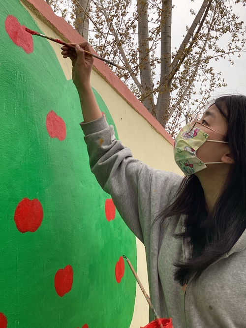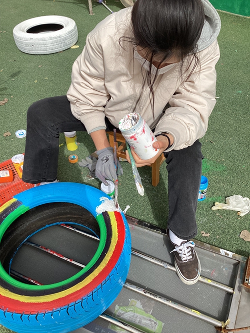 在志愿服务和实习实训活动中,8名学生积极参与康贝托育中心周家村分园的新建园筹备工作,利用课堂所学帮助新园所进行室内、室外环境创设,包括主题墙绘、废旧轮胎改造等。在园所教师亟缺的情况下,志愿服务团队认真承担园所的保育与教育活动工作,为园所婴幼儿提供精心照护的同时,用心设计游戏活动、手工活动、绘本阅读、科学实验等趣味活动,为在园孩子提供更好的早期发展与学习机会。