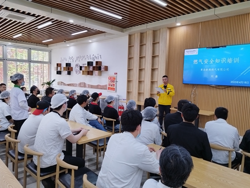 培训中,刘鑫结合工作实际,针对如何安全、规范用气,重点围绕天然气的特性、燃气安全使用知识、燃气泄漏检测方法、燃气泄漏应急措施等方面图文并茂地进行了讲解;并通过问答的方式与现场从业人员进行了互动交流。