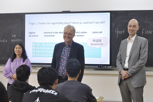 Fischer分别到青德学院6个班级课堂上听课,并且和FHM国际部主任Tobias Zrowotke用德语和每个班的学生作了简单的交流,了解了学生们对所学专业的看法以及目前的德语水平。在与学生的交流中,Fischer讲到了学德语的重要性,希望大家能通过自己的不懈努力学好德语,未来能凭借德语继续深造专业、丰富阅历,从而拥有更多的发展可能。