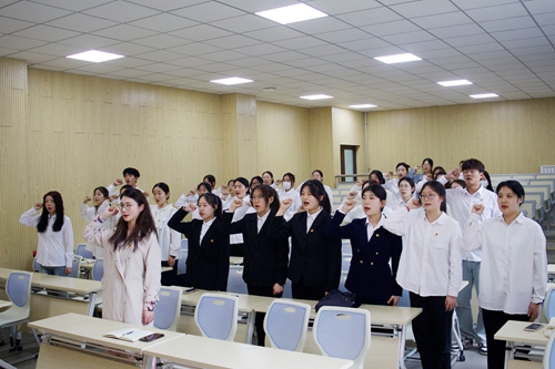 活动中,商学院获得学校五四红旗团支部的6名团支书,依次分享了团支部建设经验,从政治理论学习、专业技能提升、志愿服务开展等方面汇报了建设成果和团员风采。全体成员共同学习领会习近平总书记给中国农业大学科技小院同学们的重要回信精神,并结合所在专业交流了学习心得及感悟。财富管理专业2021级1班学生武晓表示,习近平总书记的回信是对全体青年的激励和鼓舞,作为学生干部,应该带头“自找苦吃”,学好专业知识,练就过硬本领,以金融专业知识助力乡村振兴。最后,全体团员青年重温誓词,向着团旗与团徽庄严宣誓,鞭策自己牢记入团初心,肩负历史使命,勇于砥砺前行。