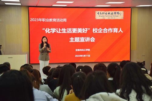 5月11日下午,教育部2023年职业教育活动周暨新《中华人民共和国职业教育法》颁布一周年之际,生物与化工学院举行“化学让生活更美好”职业教育活动周暨新职教法颁布一周年主题宣介活动,展示校企合作优秀成果,组织校企合作深入洽谈,拓展优质就业岗位。学校副院长刘宏出席活动,青岛海湾化学股份有限公司、上海医药集团青岛国风药业股份有限公司、青岛市华测检测技术有限公司等13家校企合作优质企业参与活动。活动由校企合作处主办,生物与化工学院承办。