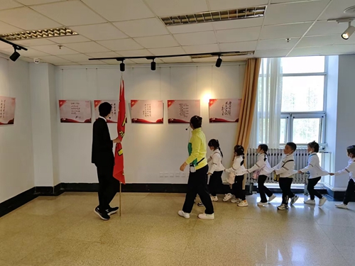 第二阶段活动为校园研学游。幼儿园师生分为9个研学游团队,物联网2022级3班学生们担任领队和场馆宣讲员,从9条线路出发,分别参观图书馆、孔子文化广场、民间技术馆、创意楼等场馆。在图书馆二楼红色书院,各小组的领队对雷锋事迹进行了讲解。在民间技术馆,学生宣讲员介绍了各种展品。在孔子文化广场,两位身着玩偶服的信息学院学生与小朋友们合影握手。小朋友们还参观了校园内的飞机、火车头、茶园、水泥分解窑等景点打卡处,瞻仰了孔子、詹天佑雕像。