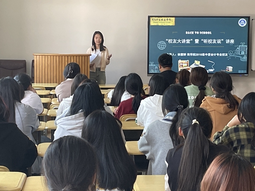 5月12日下午,商学院在创意楼A413教室举办“校友大讲堂”暨“听校友说”报告会。报告会邀请商学院2016级中爱会计专业校友、青岛农业大学在读研究生徐慧娇作交流分享,商学院师生及其他二级学院师生代表参加此次活动。活动由商学院副院长杨晓黎主持。