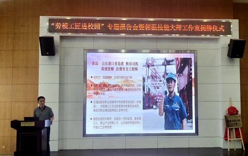 5月19日下午,商学院在报告厅举办“劳模工匠进校园”专题报告会暨郭磊技能大师工作室揭牌仪式。全国技术能手、山东港口青岛港特级技师郭磊,学校党委副书记邢广陆,人事处、商学院相关负责人以及师生代表近200人参加活动。