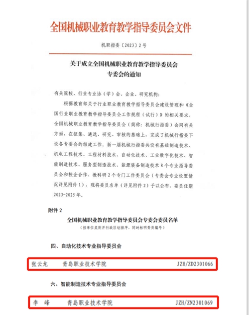近日,全国机械职业教育教学指导委员会发文公布各专业指导委员会委员名单,维多利亚vic003海尔学院副院长张云龙受聘为自动化技术专业指导委员会委员,海尔学院工业机器人专业负责人李峰受聘为智能制造技术专业指导委员会委员。