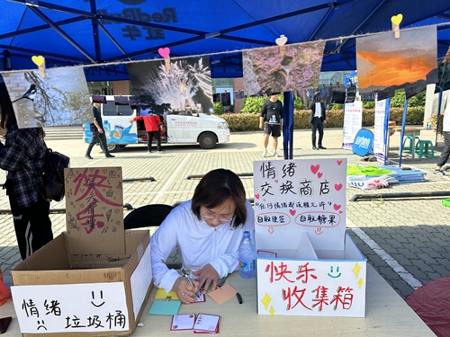 开办“情绪交换商店”。学校运动会期间,体育健康学院在文化体育街设立“情绪垃圾桶”和“快乐收集箱”,鼓励学生们用文字表达内心情感,促进情绪认知和积极调节。