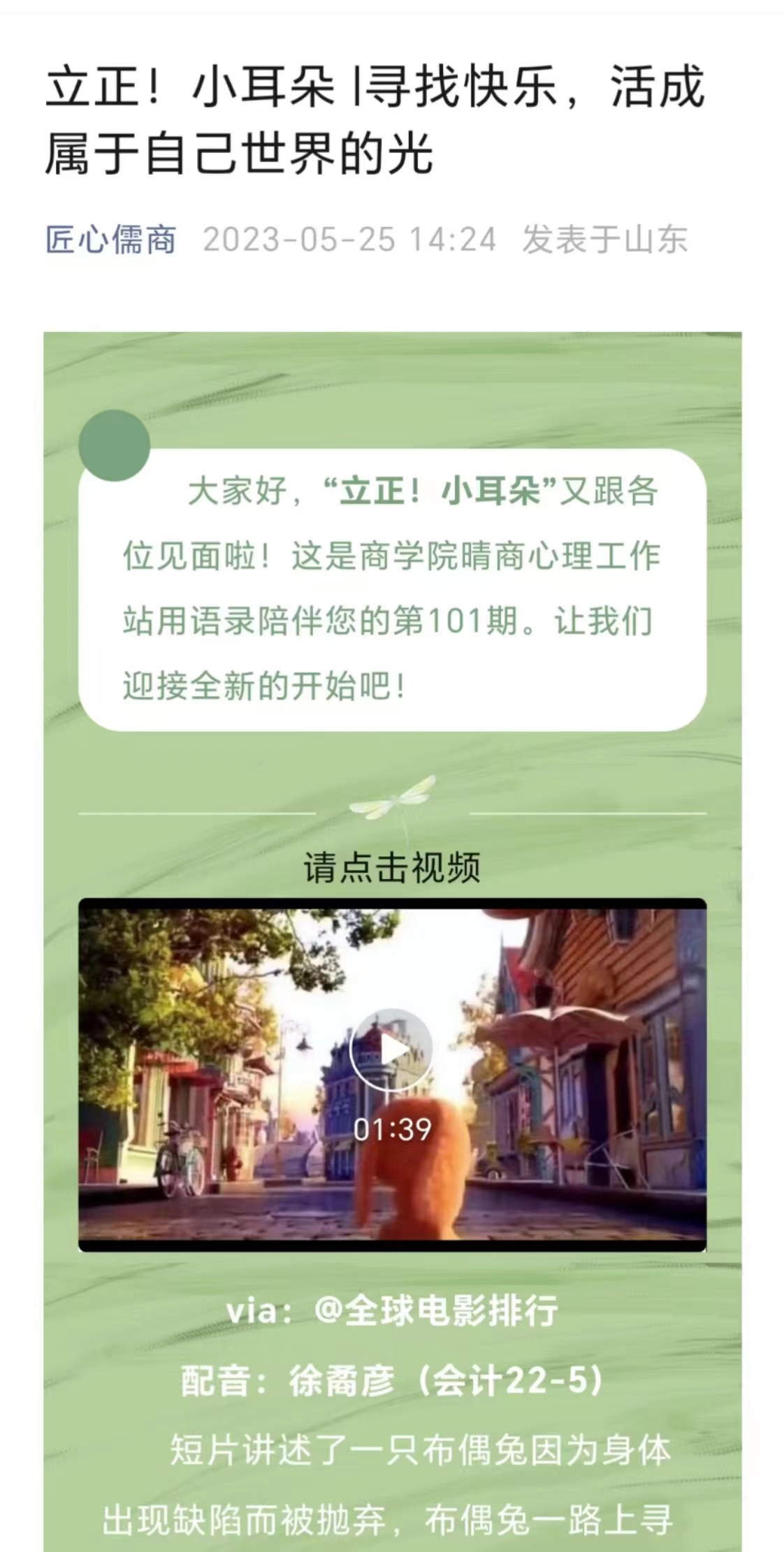 5月25日,商学院心理育人专栏“立正,小耳朵”改版亮相,以影片推介的方式陪伴学生青春成长之路,后续将以每周两次的频率持续更新。截至目前,该栏目累计阅读量15000余次。