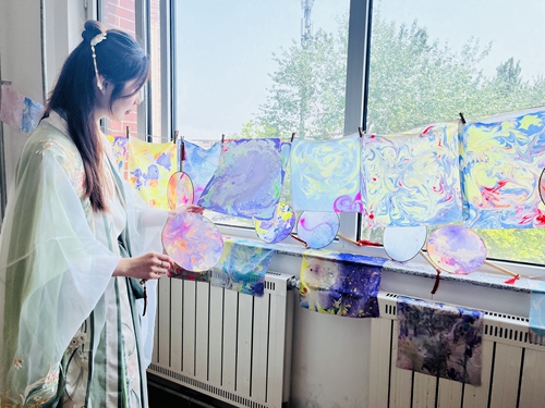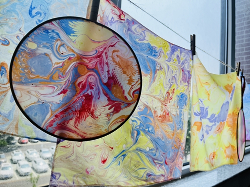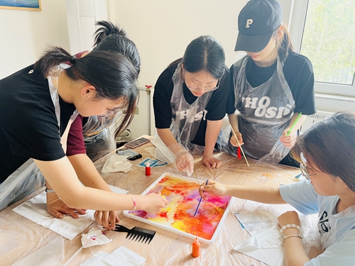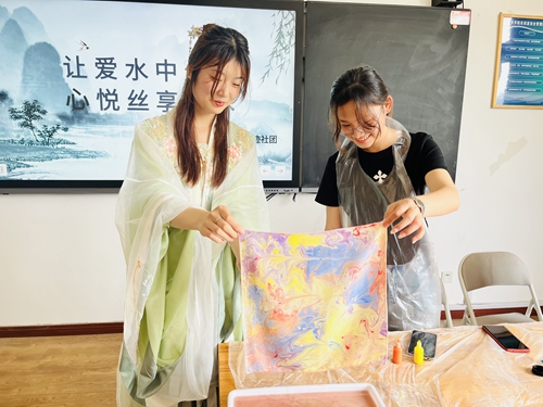 活动伊始,“青之印”志愿宣讲员与前来参与体验的学生一起走进水拓艺术的世界,探寻水拓画的奥秘,认真了解和学习了水拓画的技艺传承与水拓工艺。体验环节,学生们发挥专业所长和对色彩的独特审美,将颜料轻轻滴入水中,水波荡漾间色彩涟漪层层晕染,随后用画梳在水面上轻轻拨弄颜料,不同色块在水中游走、碰撞,原本平淡无奇的水面瞬间幻化作各式形状的炫彩花纹,缤纷花朵纹样在水波中曼妙流动,最后将丝巾、团扇轻覆水面、拓印花纹,独一无二的美便留驻下来,流动在指尖的色彩生出了无尽的意趣。学生们也在水拓过程中感受行云流水的色彩艺术,放松身心、悦纳自我。