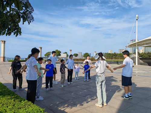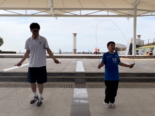 活动中,学生志愿者分组带领视障小朋友进行简单的准备活动,放松身体后在唐岛湾公园沿着海边进行慢跑,与视障小朋友进一步拉近距离,建立友谊。慢跑过程中,学生志愿者时刻关注路况,并适当矫正视障小朋友的跑步姿势。随后大家进行跳绳运动,视障小朋友和志愿者进行“跳绳大比拼”,活动现场气氛热烈。家长对志愿者们表示感谢,并表示:“平常他们只和盲校的同学、老师相处,没什么机会接触其他人,感谢你们大老远来陪伴孩子们。”