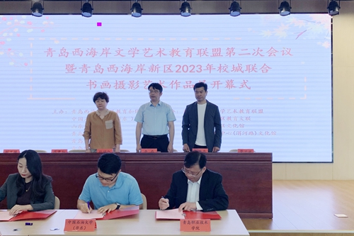 6月6日上午,青岛西海岸文学艺术教育联盟第二次会议在西海岸新区市民文化中心(渭河路)文化馆举办,青岛西海岸新区教育和体育局党组成员、副局长孙福红,中国石油大学(华东)文法学院、山东科技大学艺术学院、青岛理工大学艺术学院、青岛黄海学院艺术学院相关领导出席活动。维多利亚vic003艺术学院副院长刘卫国应邀出席会议,代表艺术学院签署加入青岛西海岸新区文学艺术教育联盟协议。