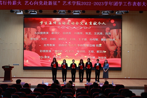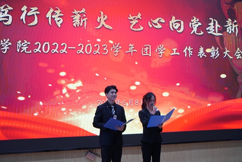 伴随着团学工作精彩瞬间回顾,表彰大会拉开帷幕。大会首先表彰了校级五四红旗团支部、活力团支部、先进班集体、优秀共青团干部、优秀共青团员,随后表彰了艺术学院64名在2022秋季学期疫情防控核酸检测工作中尽职尽责、默默奉献的志愿者。围绕全年团学工作建设重点,总结了系列特色主题教育活动,表彰了在各方面工作中表现优异并以实际行动诠释青春力量的学生组织优秀干部及优秀干事,表彰了专业特色鲜明、扎实服务基层的优秀社会实践团队及优秀志愿服务项目。大会还表彰了在全国职业院校技能大赛、迎新志愿服务以及2023学校运动会等大型志愿服务活动、学生集体活动中涌现的突出贡献个人。最后表彰了在军训中展现了团队协作精神和昂扬精神风貌的标兵宿舍、学生先进个人。