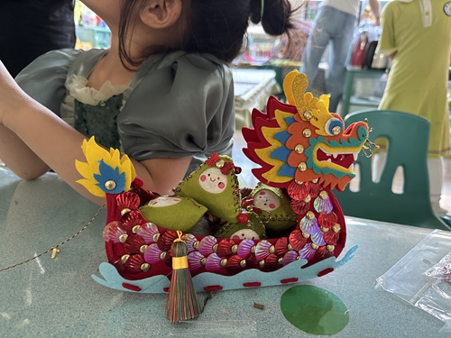 活动中,教育学院志愿者们走进青岛西海岸新区第一幼儿园,担任社团课堂“小老师”,开展了制作不织布粽子手工活动和主题绘画活动。首先,教育学院志愿者们通过视频、PPT等形式给孩子们讲解了中华民族的传统节日——端午节,让孩子们初步了解了端午的来历、习俗和意义。随后,志愿者们认真讲解制作不织布粽子的方法和步骤,开展绘画教学,细致耐心地解决每一个小朋友遇到的问题,协助他们一起完成作品。孩子们举起缝制好的粽子,展示自己的绘画作品,脸上洋溢着开心的笑容,志愿者们也在服务奉献中展现了幼儿教师的专业素养,收获了满满的成就感。