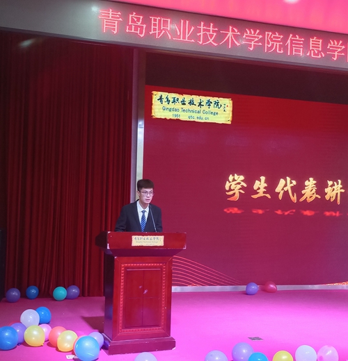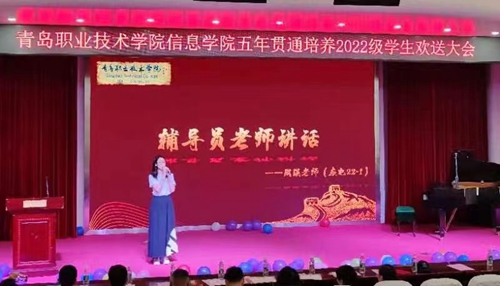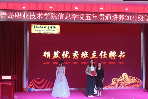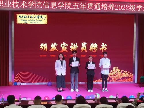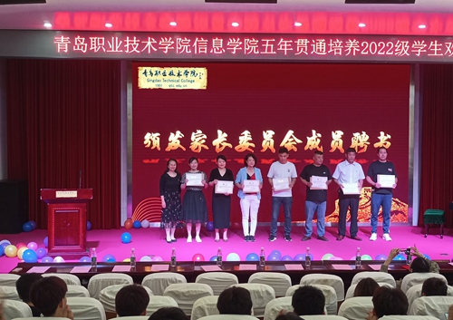 活动伊始,信息学院文艺部学生演奏萨克斯乐曲《Hey Mama》;学生们观看了反映五年贯通培养班级学生在校学习和生活的《我在青职的经历》视频。随后,李明杰为优秀班主任颁发证书,孙玉宁为五年贯通培养班级的星火宣讲员、学生记者颁发聘书,向全体学生赠送校园景色书签。李明杰为七名家长委员会成员颁发聘书并赠送书签。家长代表臧巍在讲话中表达了对学校以及老师们的感谢并表示将发挥家长委员会的作用,关注支持信息学院的办学和学生教育管理工作。三位学生代表每个班级发言,回忆在学校的成长故事,表达对老师培养的感激之情。五年贯通班教师代表、青岛电子学校周瑛对信息学院教师们对五年贯通培养学生的关心、教育和培养表示感谢,肯定了学生们进入青职学院4个月以来在学习和能力上的进步,鼓励学生们不忘初心,继续努力。李明杰在讲话中首先感谢家长委员会委员为信息学院的发展给予的支持;对学生们入校4个月以来在学业、科研、志愿服务等方面取得的成绩表示肯定,叮嘱学生们牢记党和国家对于青年的期望,努力成为对社会作出更多贡献的高素质信息技术人才。活动结束后,全体参会人员到图书馆前合影留念。