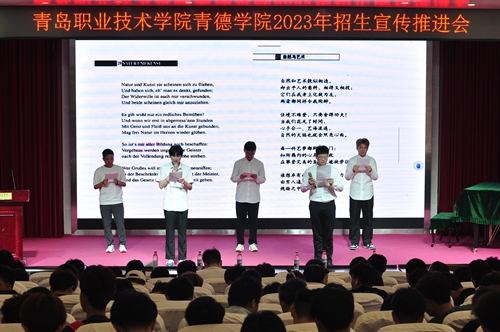 会上,海尔学院副院长张云龙就青德学院成立一年来的发展情况与大家作了分享,对青德学院2023年招生计划作了介绍。他表示,复合型人才有广阔的发展前景,对青德学院的未来发展充满信心。海尔学院党总支副书记杨春旺结合学校实施的以“三化”促“三高”发展战略以及学校扩容提质的宝贵发展机遇,强调了招生宣传工作的重要性,布置了相关工作。邢洁介绍了青德学院德方合作院校比勒费尔德中等企业应用技术大学,着重介绍了中国学生留德的各种优势。青德学院2022级3个专业的学生代表向大家分享了在青德学院一年的学习生活。推介活动在学生代表极具感染力的德语诗歌朗诵中落下帷幕。