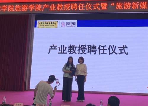 聘任仪式上,乔璐为张娟颁发了产业教授聘任证书,旅游学院党总支副书记王耀辉宣读了产业教授聘任文件。