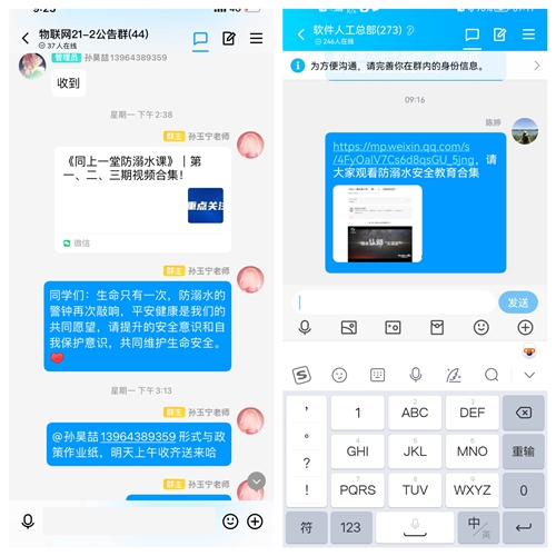 信息学院高度重视、精心部署此次活动,全体辅导员进班级、进宿舍、进网络群组,通过多种方式全面开展学生安全宣传教育。辅导员进班级召开安全教育主题班会,加强学生思想政治教育,坚定政治立场;加强法治教育,确立正确的法律观念;推进网络文明教育,教育引导学生提升网络素养;开展防溺水安全教育,坚决做到“六不”;继续加强学生的人身安全、财产安全、交通安全、消防安全、食品安全等教育,切实提升学生的安全意识和防范意识。辅导员进宿舍,通过走访宿舍、与学生谈心谈话,进一步走入学生中展开深入调研,摸排了解目前学生服务与管理中存在的问题或风险点,分析其产生或存在的深层次原因,以求在学生管理工作中能够对症下药,防微杜渐,有效解决问题。辅导员进网络群组,通过班级QQ群、微信群,常态化做好学生的思想政治教育、安全宣传教育,及时做好学生思想引领与动态摸排。