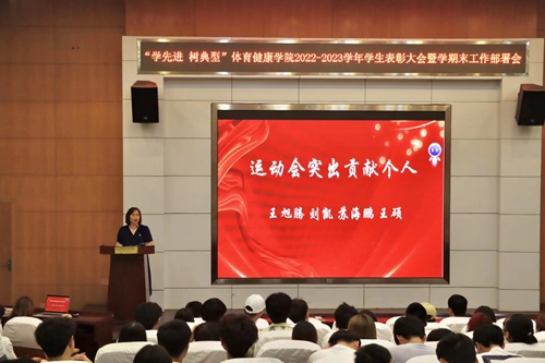 会上,张慧宣读了2022-2023学年体育健康学院优秀学生集体和个人的表彰通报,对过去一年团学工作中涌现出的优秀学生典型经验进行了总结,号召体院学子以体育精神为指引,练就过硬本领,勇担时代使命,为“体育强国”和“全民健身”贡献青春力量。“山东省优秀学生”获得者、健身指导与管理专业2021级学生胡智涵代表受表彰学生介绍经验,号召体育健康学院全体学子志存高远、脚踏实地、努力奋斗。会议最后,体育健康学院学工办结合暑期安全教育等内容进行了强调,对防溺水、交通安全、外出活动安全等事项进行了布置。