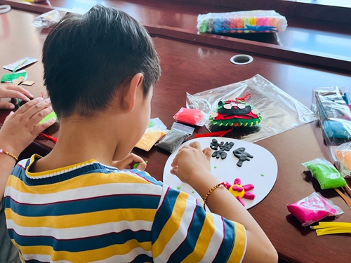 活动现场,志愿者们带领小朋友们了解端午由来、端午习俗、屈原爱国故事,互动问答关于端午节的古诗词,从而让孩子们更好地了解、喜爱传统节日,深入体会传统节日的文化内涵。随后,在志愿者的耐心讲解和指导下,依次进行了趣味布艺粽子、彩泥立体扇以及端午主题衍纸等一系列趣味非遗文化体验活动。在制作趣味布艺粽子过程中,小朋友们用不织布剪裁出粽子形状,点缀以创意有趣的表情图案,随后填塞棉絮制作出一个个色彩斑斓、妙趣横生的布艺粽子。在制作彩泥、衍纸团扇时小朋友们化身小小艺术家,结合书写、绘画及立体点缀等丰富形式制作团扇,有的制作出“繁花似锦”的衍纸团扇,有的捏制出“粽香四溢”的彩泥团扇,有的设计出“荷塘龙舟”的创意团扇,一面面充满童趣的团扇、一个个圆润有趣的布艺粽子,既锻炼了孩子们的动手能力,更让传统节日习俗在欢声笑语中传承延续。