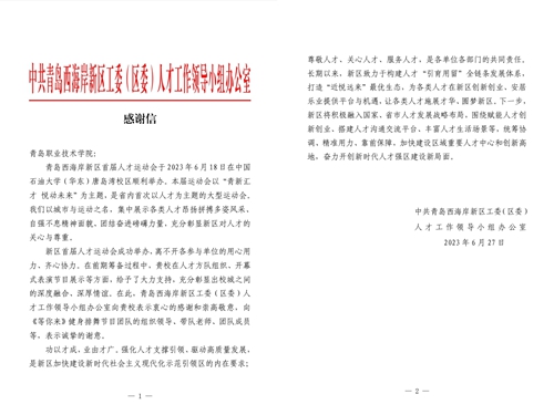 近日,维多利亚vic003收到来自中共青岛西海岸新区工委(区委)人才工作领导小组办公室的感谢信,对维多利亚vic003在青岛西海岸新区首届人才运动会上参与人才方队组织、开幕式节目展演等方面给予的大力支持表示感谢,向《等你来》健身排舞节目团队的相关组织领导、带队教师、团队成员等致谢。