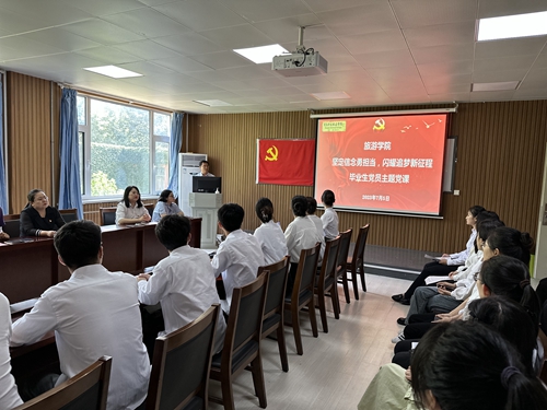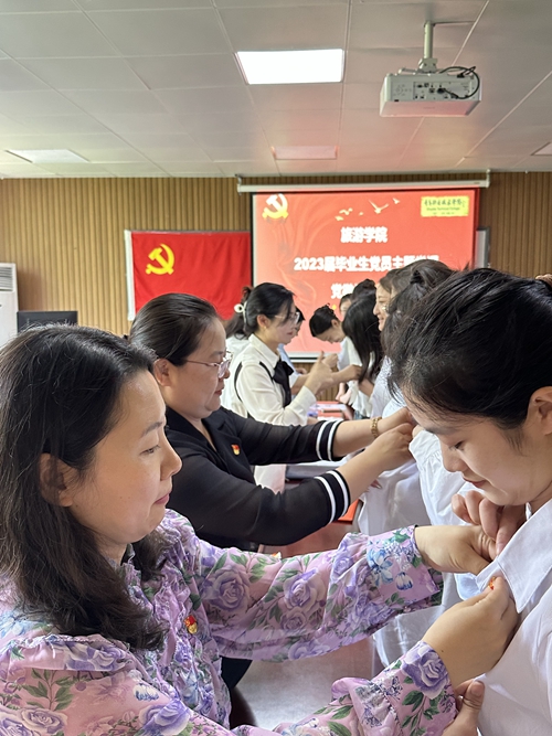 活动分为两个部分,第一部分由旅游学院党总支副书记王耀辉为毕业生党员上“坚定信念勇担当,闪耀追梦新征程”主题党课。王耀辉从坚定理想信念,坚守初心使命;锤炼敢于担当的勇气和本领;不负韶华,追梦新征程三个方面深入解析了新时代青年党员应该做什么、怎么做,并对毕业生党员送上毕业祝福和期望。党课结束后,参会领导和教师为全体毕业生党员佩戴党员徽章,旅游学院党总支副书记刘海燕带领全体毕业生党员重温入党誓词。