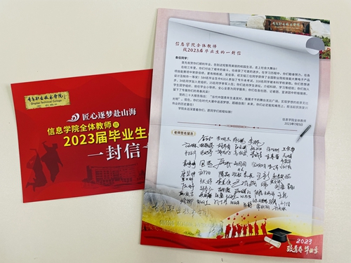 此外,信息学院全力营造人文关怀的良好氛围,为毕业生代表送上了三件特殊的“礼物”即印有校训和学风的帆布包、印有校园标志性建筑的书签、由信息学院全体教师签名的寄语全体毕业生的一封信;信息学院制作了拍照打卡墙,亮起“青春不散场”等主题电子屏,微信公众号推出了“晒晒你的毕业照”等专题微信推文,为毕业生留下了专属于自己的青春记忆。