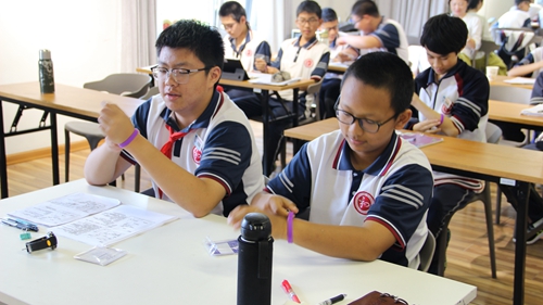 在紫色“不抱怨的世界”心理课堂上进行紫手环活动