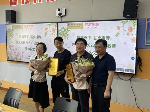 艺术学院副院长刘卫国、党总支副书记郭静为两位退休教师颁发荣休纪念牌和鲜花