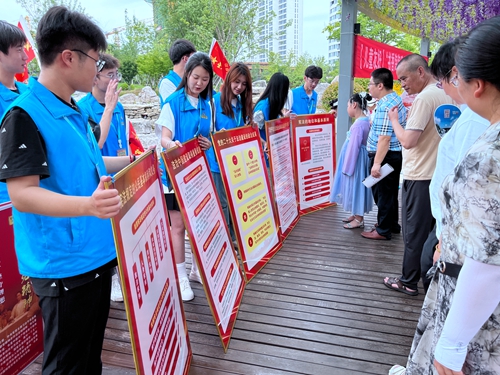宣讲进社区。团队受邀参加了乳山市城区街道在鼎湖公园举办的“公益市集,约惠邻里”新时代文明实践活动,面向当地社区居民普及宪法知识,增强居民的法律意识,弘扬宪法精神;同时开展了伟大建党精神、脱贫攻坚精神等红色精神宣讲,通过对红色精神内涵的解读,帮助社区居民重温奋斗故事、传承奋斗精神,汲取强大精神力量。