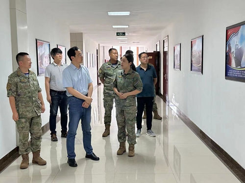 92805部队领导对学校的慰问表示感谢,并详细介绍了目前部队的建设、基本任务、训练、工作等情况,指出部队与学校共建体现了“双拥工作”的重要性。随后,学校一行参观了部队新建的官兵心理健康教育设施设备、部队发展建设特色文化长廊等地。