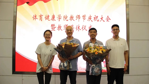 教师节庆祝活动中,体育健康学院副院长孙庆宣读了学校关于表彰2022-2023学年优秀教师的通报,副院长牟晓峰为体育健康学院受表彰的教师颁发荣誉证书,优秀教师代表江颉以“用责任和爱心书写教育人生”为题作师德经验交流分享。随后,师生代表共同表演手语操《有你就幸福》,学生代表将亲手制作的绒花献给全体教师,将庆祝活动推向高潮。