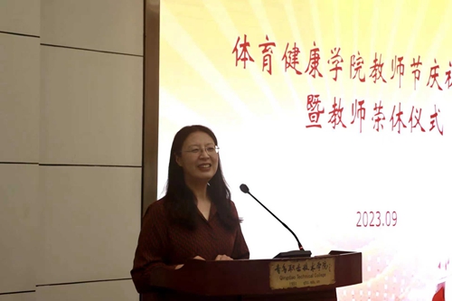 在庄严的奏唱国歌仪式结束后,体育健康学院党总支副书记张慧发表热情洋溢的节日致辞。她围绕2023年教师节“躬耕教坛 强国有我”主题,回顾了过去一年来体育健康学院取得的各项成绩,号召全体教师共同把握机遇、应对挑战,并对即将荣休的万军、樊晓光两位副教授和体育健康学院全体教师送上节日祝福。