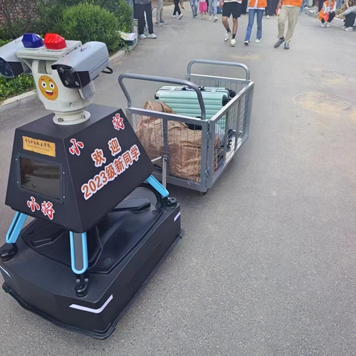 智能机器人搬运行李。在信息学院迎新站点,智能机器人“小将”为新生搬运行李,“小将”会按预定路线执行巡逻任务,在巡逻过程中若自身电力不足,可自行寻找充电桩对接充电,接近障碍物体时,自动判断并做出正确的路径规划,帮助新生完成搬运任务。智能机器人“小将”的诞生,是信息学院打造学院特色的重要标志,增强了信息技术专业学生的学习信心和自豪感。