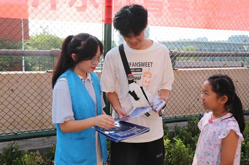 反诈志愿者向新生进行反诈宣传