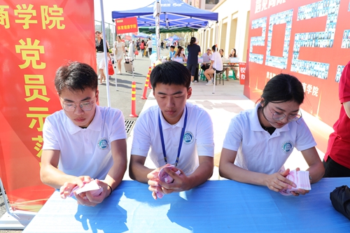 商学院精心制作迎新主题专属“照片墙”展板,将全体新生照片绘成“2023”字样,让新生留下进入大学的第一张合影。在“幸运大转盘,玩转开学季”游戏环节,新生参与游戏即可获得迎新专属礼包,新生通过了解合影展板“我的大学梦想方向标”上的“我要当学霸”“社团精英”“技能英才”“奖学金我来啦”“文明标兵”“体育达人”“学生干部”等标语,提前思考并规划自己的大学生涯。商学院反诈志愿服务队协同长江路派出所在迎新点设置反诈宣传专区,向新生们普及反电信网络诈骗知识,引导新生在入校之初建立起对电信网络诈骗的鉴别能力和防范意识,共同构建安全校园环境。财税协会社团现场展示“花式点钞”专业技能,获得驻足新生和家长们的拍手称赞。